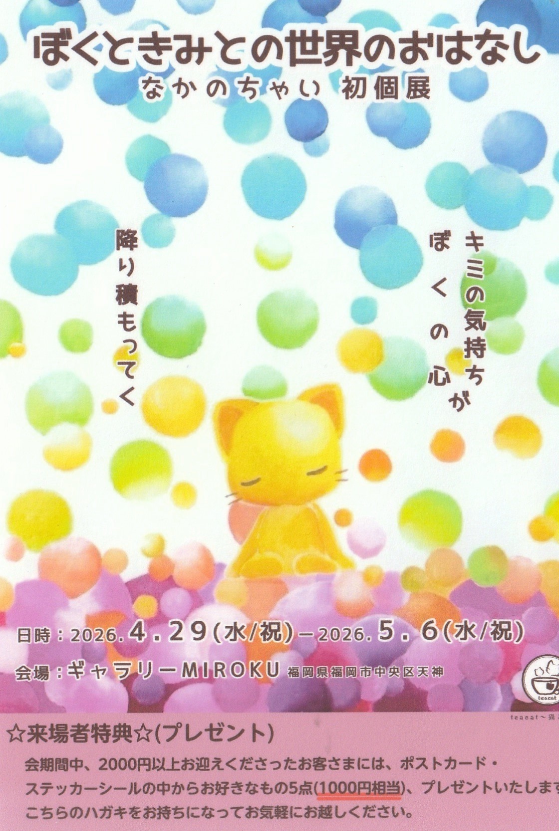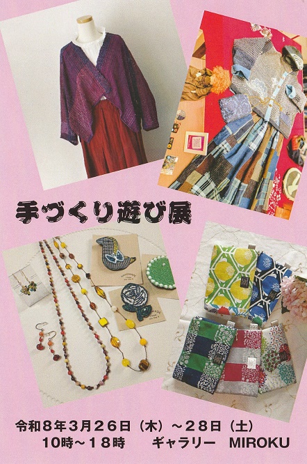 3/20(金)~22(日)Tole Painting Bonnie教室作品展 3/26(木)~28(土)手づくり遊び展 出展者 古布工房ののや ゆっさんご手織り作家 ワイワイシュガー ポーチgarden 4/29(水/祝)~5/6(水/祝) ぼくときみとの世界のおはなし なかのちゃい初個展
